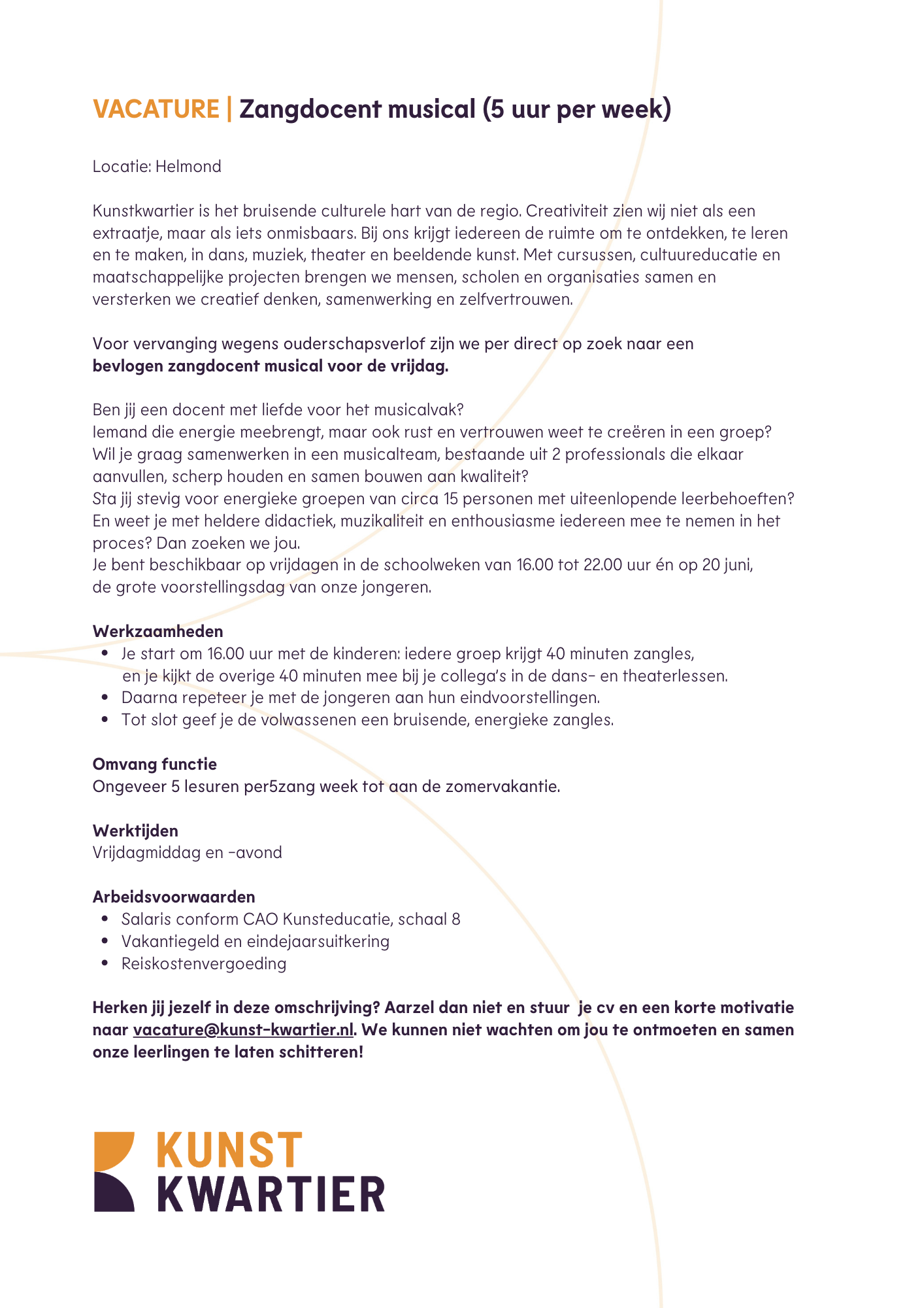 Overweeg jij een avontuur bij Kunstkwartier? Hier vind je de leukste banen en mogelijkheden om vrijwilligerswerk te doen. Heb je vragen over onze functies of ben je nieuwsgierig naar het Kunstkwartier-werkleven? Aarzel niet om een e-mail te sturen info@kunst-kwartier.nl.